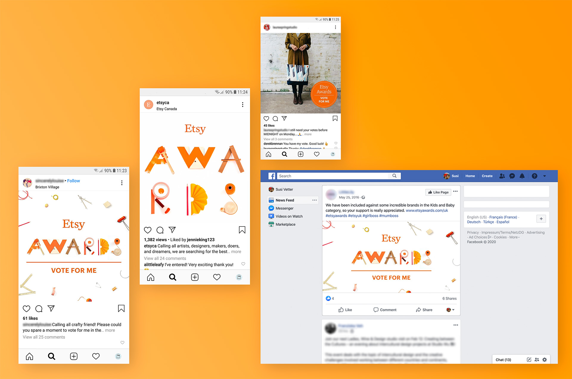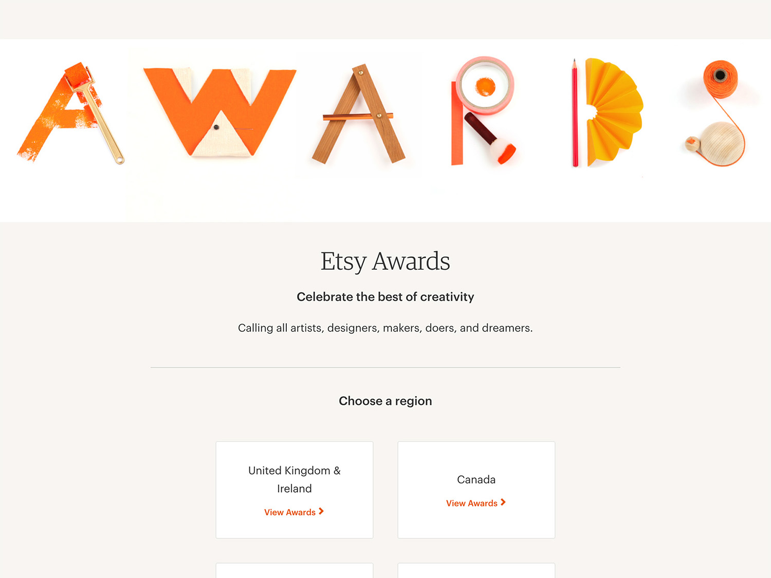 Etsy is an online marketplace for handmade goods with over 95 million active buyers. The Etsy Awards were created to spotlight outstanding makers across the world. The challenge was to build a campaign that felt unmistakably “Etsy” while being flexible enough to roll out across multiple regions, languages, and marketing teams — all without losing the warmth and creativity the brand is known for.